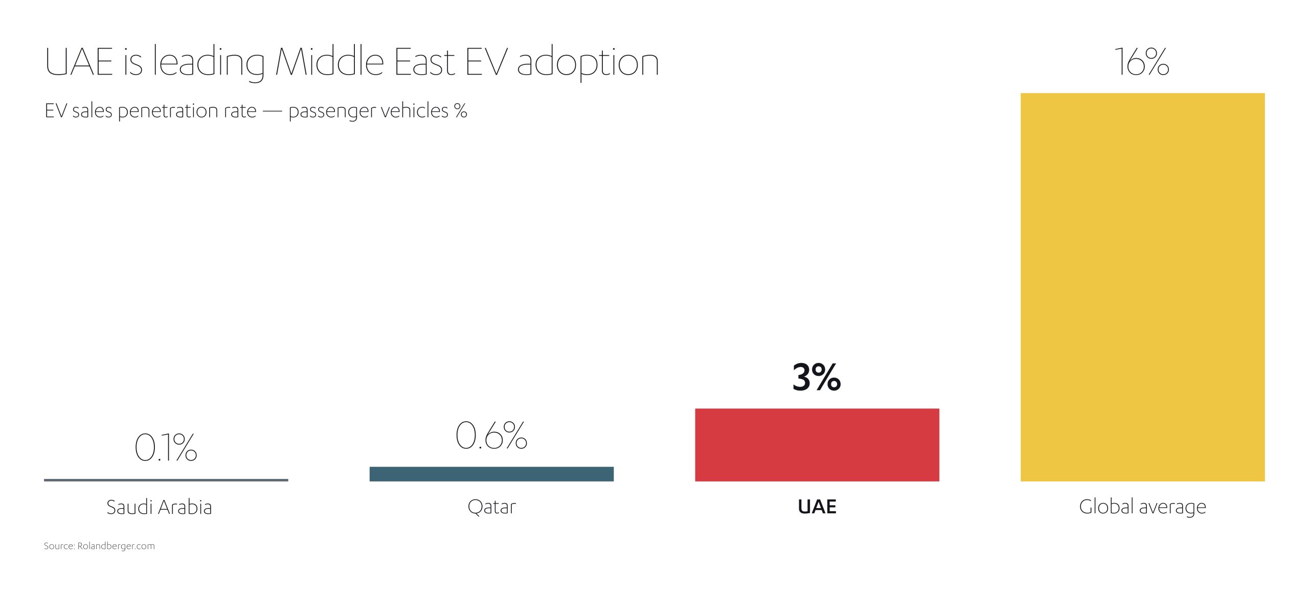 أما دبي، فهي تقود الجهود عبر استراتيجيتها للتنقل الأخضر لعام 2030، والتي تستهدف إضافة أكثر من 40,000 مركبة كهربائية على الطرقات بحلول نهاية العقد. وكجزء من خططها لتحقيق هذا الهدف، تستهدف الحكومة أن يكون 30% من أسطول سياراتها كهربائياً أو هجيناً بحلول عام 2030. وكجزء من استراتيجيتها لتسهيل امتلاك المركبات الكهربائية، أعلنت الحكومة أن 5% من جميع أماكن وقوف السيارات ستخصص من الآن فصاعداً وبصفة حصرية للمركبات منخفضة الانبعاثات.