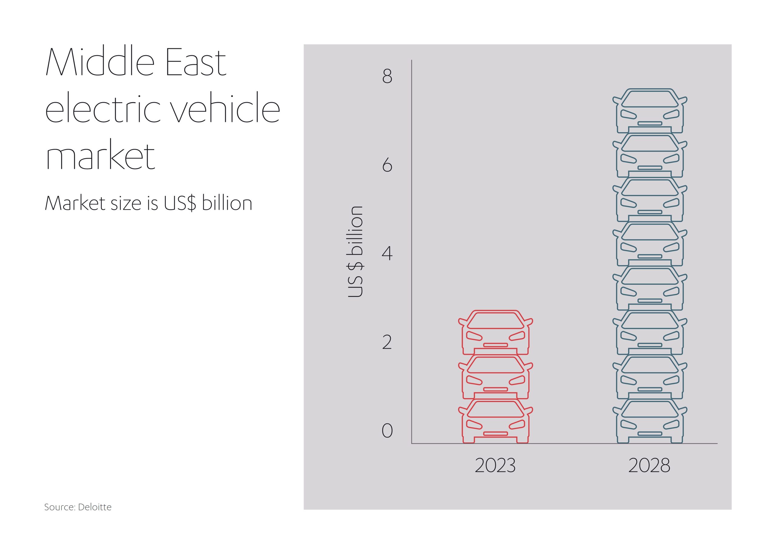 مدفوعة بهذا النجاح، تأمل الإمارات أن يكون نصف السيارات على طرقاتهاكهربائية بحلول منتصف القرن. ويبدو أن هذا الحماس قد يتحول إلى عدوى إيجابية تنتقل بسرعة إلى باقي أسواق الشرق الأوسط، إذ يتوقع خبراء الصناعة أن يشهد السوق طفرة كبيرة، حيث تتوقع شركة الاستشارات العالمية «ديلويت» (Deloitte) أن ينمو سوق المركبات الكهربائية في المنطقة ليصل إلى 7.65 مليار دولار بحلول عام 2028، أي ما يقارب ثلاثة أضعاف قيمته في 2023 التي بلغت 2.7 مليار دولار [6].