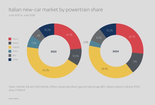 ففي عام 2025 بلغت حصة مبيعات السيارات الهجينة مستوى واعداً عند 44.7%، ارتفاعاً من 39.9% في عام 2024. غير أن السيارات الهجينة — كما يشير اسمها — تعتمد أحياناً على منظومة محركات الاحتراق الداخلي في تشغيلها، وهو ما يقلل من الفوائد المناخية الإجمالية التي توفرها. أما مبيعات السيارات الكهربائية بالكامل في إيطاليا فقد بلغت 94,230 سيارة في عام 2025، بما يمثل حصة سوقية قدرها 6.2%. ورغم أن هذا يمثل نمواً سنوياً قوياً، إلا أنه ظل أقل بكثير من متوسط حصة السيارات الكهربائية التي تعمل بالبطارية في أوروبا، البالغ 19% في عام 2025. ومع ذلك، لا يزال المصنعون متفائلين، ويواصلون دعم وتوسيع عروضهم في جميع قطاعات سوق السيارات الكهربائية.