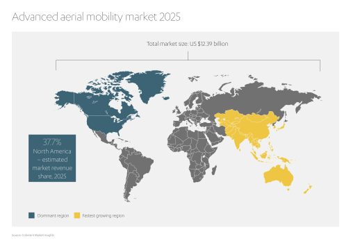 Market insights show that just over 37% of all economic activity in the UAM sector during 2025 has been based in the USA, with Asia and Oceania representing regions of fastest growth.[3]