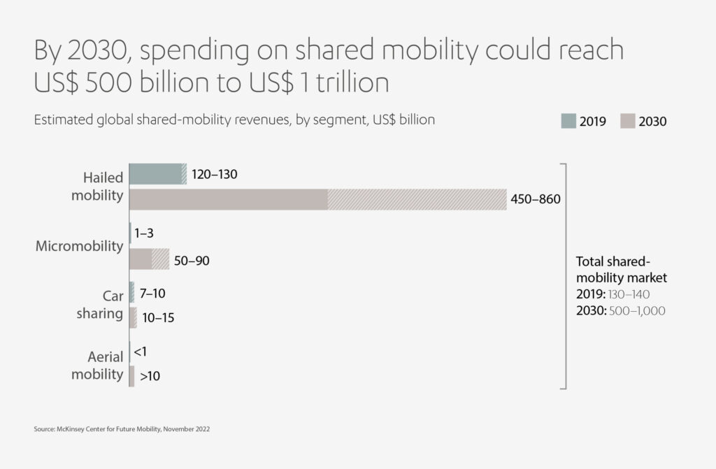 According to the experts at McKinsey[12], consumers racked up more than 15 billion hailed-mobility trips in 2022, with revenues reaching US$ 165 billion. By 2028, total revenues from hailed mobility could increase to US$ 273 billion.[13]