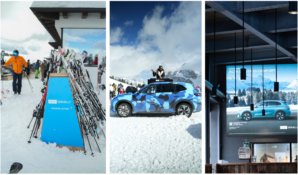 One of the most prominent early activations was “Winter Domination”, held at the Piz Sella ski facilities in the Dolomites. Running across January and February, the campaign transformed the location into a branded Geely experience through print and digital billboards, a takeover of the Rifugio Comici mountain lodge, a branded snowpark, and the Geely DJ Car après-ski format. Three DJ events, including appearances by DJ and influencer Isa Iaquinta, attracted an average of 1,200 guests each and generated more than 150,000 Instagram impressions, helping Geely connect with younger, lifestyle-oriented audiences.