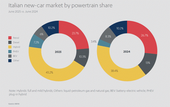 相应地,绿色汽车的销售占比正在增长。混动、插电式混动 (PHEV) 和纯电动 (BEV) 车型共占 2025 年意大利新车总销量的 56.7%,比之前一年的 50.1% 有所上升。而纯汽油和柴油车的情况恰恰相反,同期销量占比从 39.7% 下降到 34%。[6]
